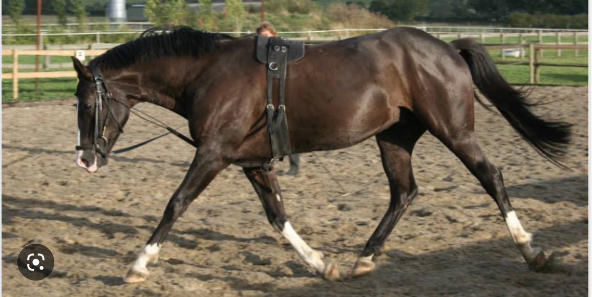 El caballo del vídeo para mi gusto va demasiado abajo y detrás de la vertical, no está ejercitando su línea superior, está trotando como puede con el cuello bajo. La idea es que el caballo estire, no que se encoja. Y encoger se encoge tanto si va con el cuello muy arriba como si lo lleva muy abajo y metido adentro. Tienes que pensar en que la nariz, el cuello, la espalda y el tranco se hacen más largos (no más rápido) y la nariz esté justo en la vertical o idealmente un poco por delante para que estire y meta los pies de forma óptima.