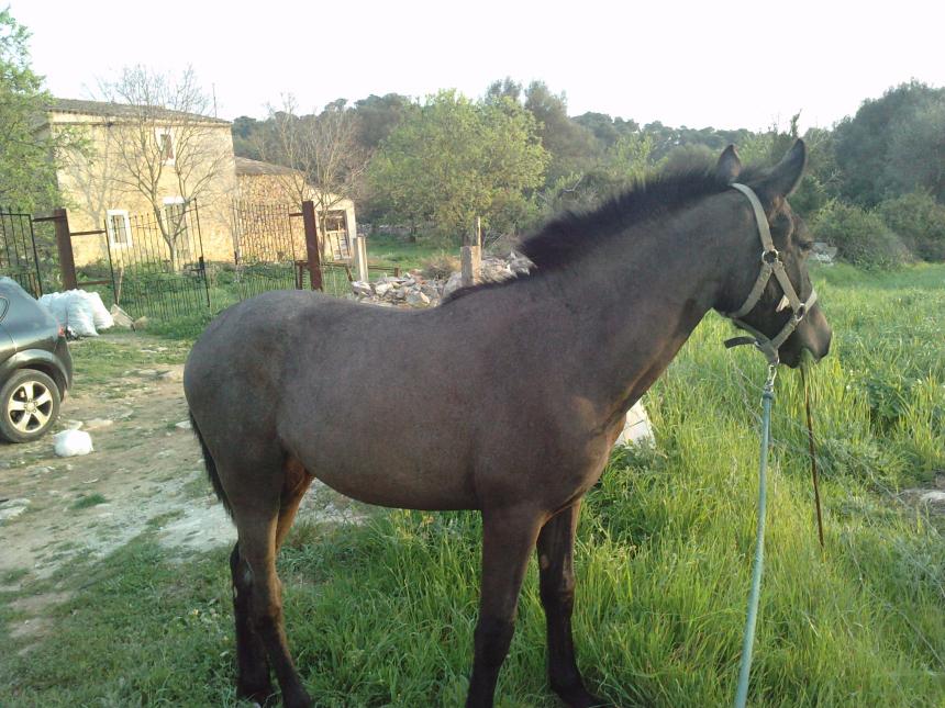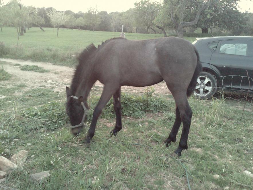 el caso es que al ser novata pense que lo mejor era cogerla y como hasta los tres años o mas no se puede empezar a montar asi nos acostumbrariamos mutuamente, se llama Luna Dylan, en los papeles, y le llamamos Lluna que es luna en mallorquin, es muy mansa, aunque algunos dias es bastante nerviosa y asustadiza, hace una semana que la tengo, hay dias que la puede pasear un niño ya que va donde la lleves (para sacarla a pastar, cambios de sitio...) pero otros que no se porque resulta dificil ya que empieza a apoyar su peso en tu lado y cuando le dices que vaya hacia adelante empieza a girar hacia otro lado con fuerza. tambien da las patas sin problema cuando esta relajada, ya que si esta muy nerviosa, le cuesta bastante, deja que la toques por todo, incluso que apoyes los brazos y cabeza encima de su espalda/lomo (como si la abrazaras o durmieras en ella, estando yo de pie a su lado) , quiero empezar bien con ella y al ser novata quiero hacerlo bien, por eso queria pediros ayuda, hasta que tenga la edad para contratar a un professional para domarla.