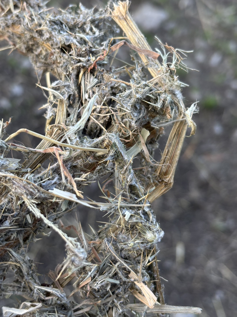 El martes cogí 2 láminas para darles forraje y me pinché. Asique bien dramática como siempre rompí todas las pacas y en todas había ramitas con una especie de pelusa y púas. Mire un poco por internet, y como se parecía a fotos que había de hierba con moho aparte la hierba y le dije a la del terreno que la hierba tenía moho(añadir que grabe como rompía todo e iba sacando las ramas esas,para quejarme al vendedor obvio)